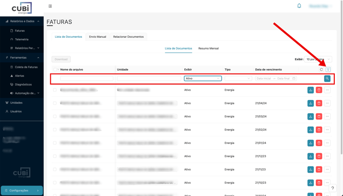 - Você pode usar a função de filtro para selecionar documentos de interesse clicando no ícone de filtro na direta, aplicando a condição e em seguida clique na lupa para aplicar o filtro.