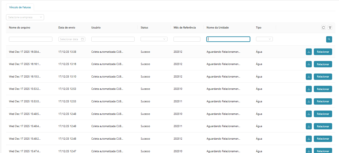 Ao contrário de Faturas de Energia em que nossa plataforma já faz o relacionamento automático automático de documentos com as Unidades cadastradas através do número da Unidade Consumidora, os documentos de Danfe e Fatura de Água precisam ser relacionados à Unidades existentes.
